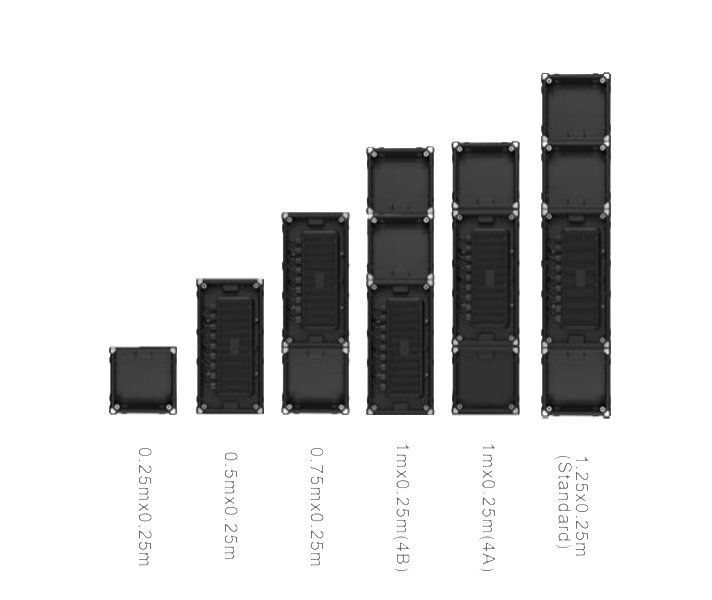 The standardized cabinet,1.25(W)x0.25(H)m per piece, fits modules in different pixel pitch of P2.9,P3.9,P4.8,and modules can be replaced freely.