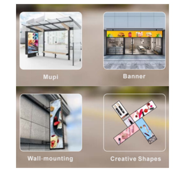 Bus shelter led screen,bank/store banner,wall-mounting led,creative shapes and other installation methods are available.